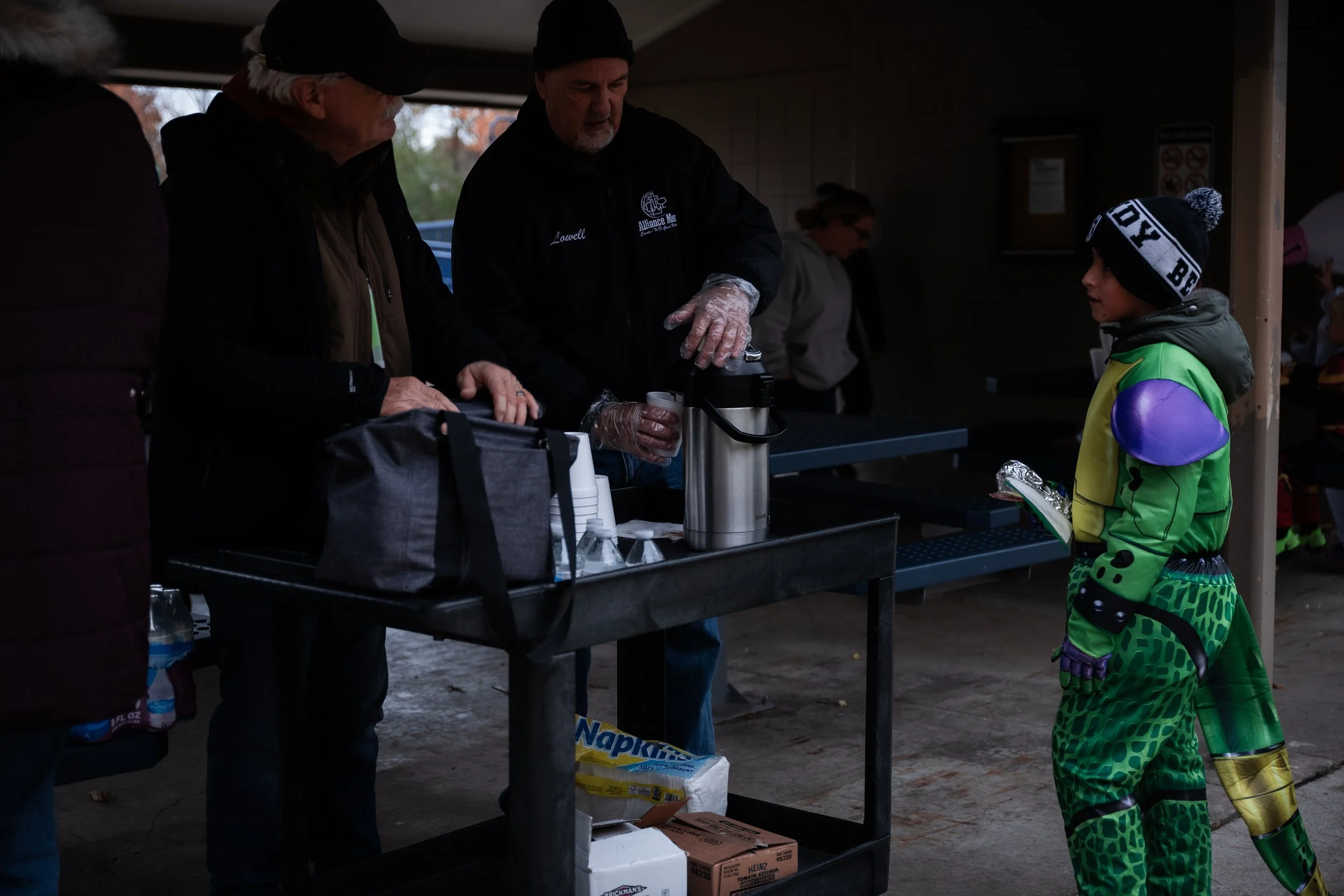 A fully staffed food pavilion serving hundreds of free hotdogs, chips, and hot cocoa
